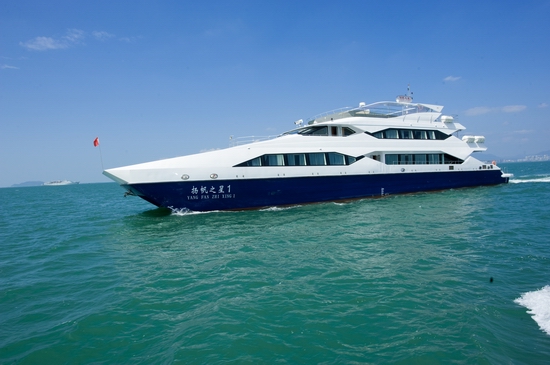 于2011年11月底下水,是我司根据多年的接待经验及多方位地区考察为夜游三亚湾、大型会议团队的接待量身定做而成。船体采用玻璃钢制造,双体更平稳。长42米。宽10米,分上中下三层,一楼约200平米,配有最新的舞台灯光及音响设备,内舱船头超大舞台新增投影设备,可与二楼投影幕布同步进行播放,一楼内舱船尾部分除洗手间、吧台外另增设配膳间,可提供鲜榨果汁等简易饮品。该层同时容纳120余人。二楼主要是卡拉OK点唱,歌库每月更新当下最新的流行歌曲。可同时容纳90余人。三楼为360°观海平台,约120平米,宽敞甲板可供50人同时观赏南海风光。扬帆之星乃我司在2012年主要推广产品,将以全新的服务队伍及三亚游艇业独有的资源为您